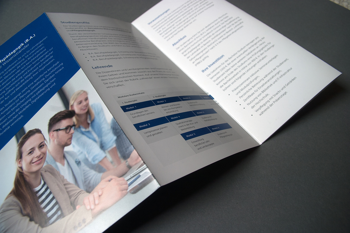 Das Zentrum für Wissenstransfer bietet den Studiengang Bachelor Berufspädagogik als weiterbildenden Studiengang an. Für dieses Bildungsangebot erarbeitete ich ein Faltblatt im Format DIN lang im Wickelfalz, welches alle wesentlichen Informationen des Studienganges auf 8 Seiten darstellt. Das Faltblatt soll das Interesse für den kostenpflichtigen Studiengang wecken. Das Grafikdesign des Faltblattes basiert auf dem Corporate Design des Zentrum für Wissenstransfer. Der Druck des Faltblattes erfolgte auf einem Papier mit einer Grammatur von 250g/m2, welches dem Faltblatt Wertigkeit und damit Seriosität verleiht.