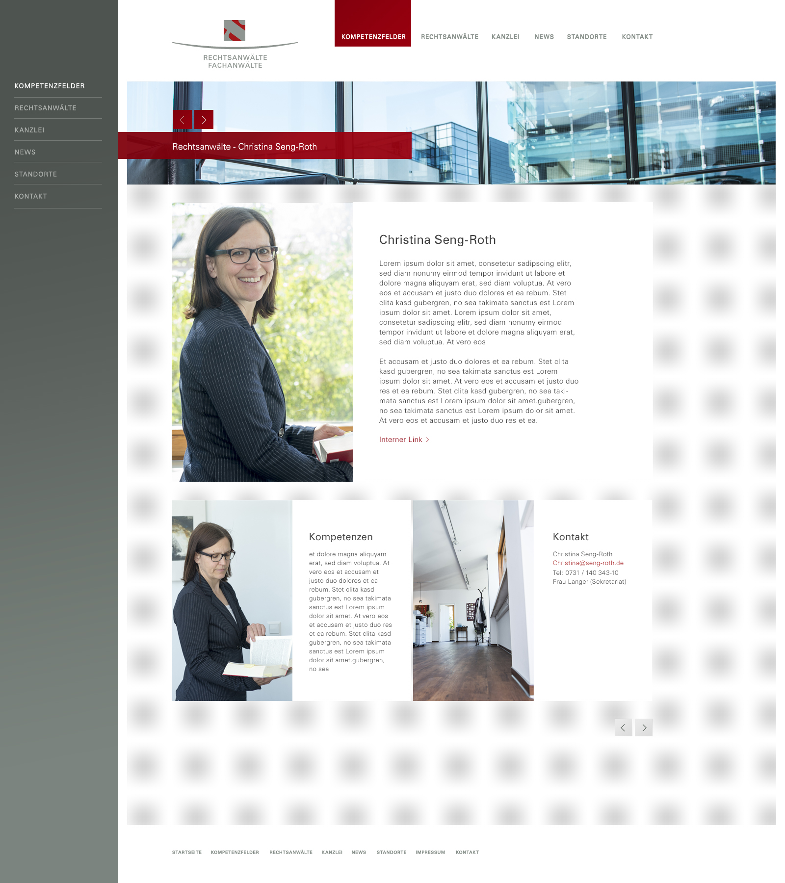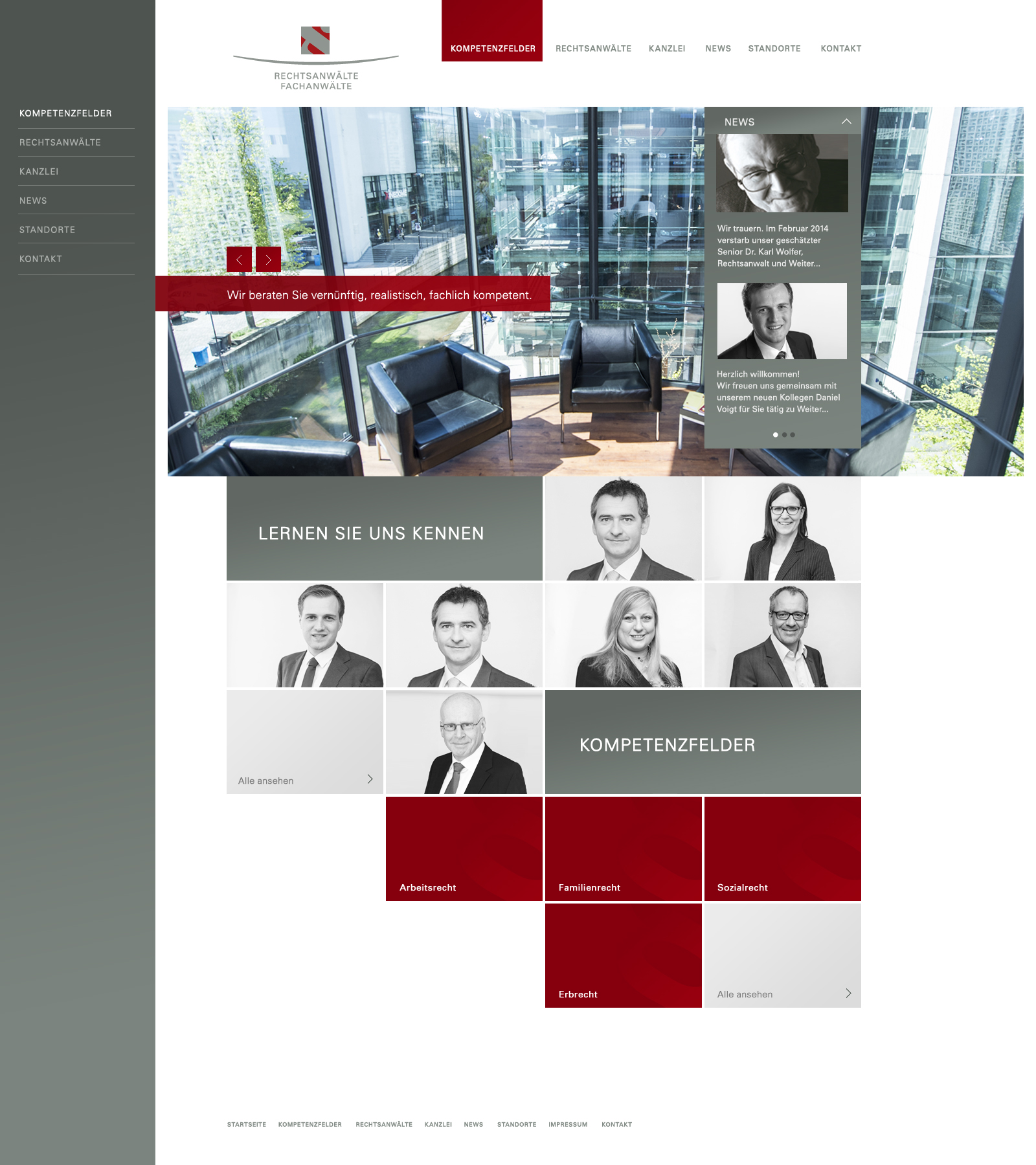 Für die Kanzlei entstanden Konzept und UI-Design für den Internetauftritt. Die Herausforderung bestand darin ein innovatives Design zu entwerfen, welches das vorhandene Corporate Design integriert sowie Kompetenzfelder, Rechtsanwälte und Standorte der Kanzlei schnell zugreifbar, gut strukturiert auf einer visuell ansprechenden Website präsentiert.