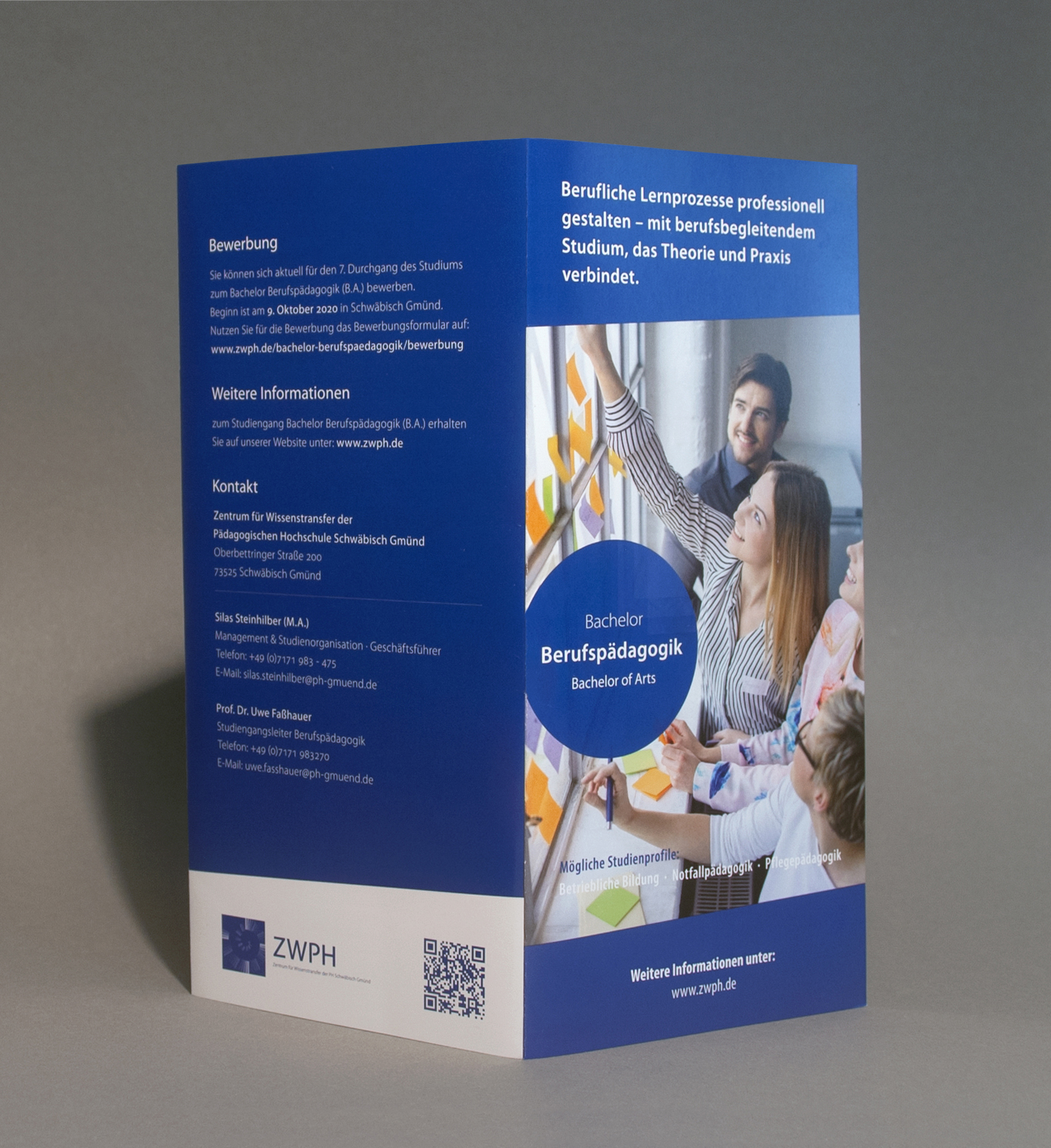 Das Zentrum für Wissenstransfer bietet den Studiengang Bachelor Berufspädagogik als weiterbildenden Studiengang an. Für dieses Bildungsangebot erarbeitete ich ein Faltblatt im Format DIN lang im Wickelfalz, welches alle wesentlichen Informationen des Studienganges auf 8 Seiten darstellt. Das Faltblatt soll das Interesse für den kostenpflichtigen Studiengang wecken. Das Grafikdesign des Faltblattes basiert auf dem Corporate Design des Zentrum für Wissenstransfer. Der Druck des Faltblattes erfolgte auf einem Papier mit einer Grammatur von 250g/m2, welches dem Faltblatt Wertigkeit und damit Seriosität verleiht.