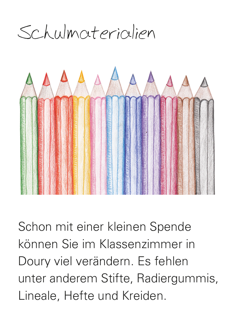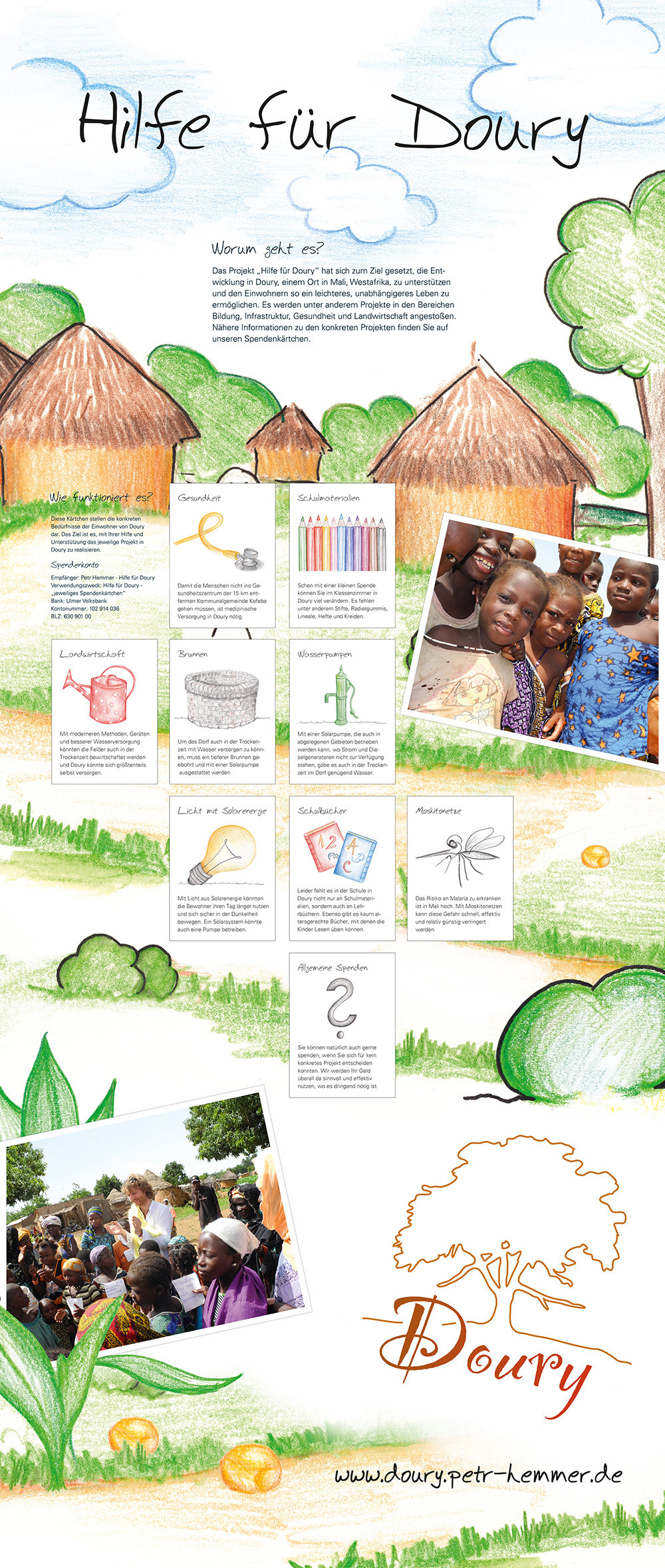 Für ein Hilfsprojekt in Mali entwickelte ich in Zusammenarbeit mit dem Ulmer Geiger Petr Hemmer Logo, Flyer und die Projektwebsite. Passend zu den Medien erstellte ich die Illustrationen. Für die Präsentation des Projektes auf einem Benefizkonzertes des Ulmer Liedermachers Walter Spira entstanden Informationskärtchen für Projektspendengläser sowie ein Roll-Up-Banner, um interessierte Besucher über das Projekt zu informieren. Das Projekt wurde von Petr Hemmer initiert und durchgeführt. Die Projektwebsite ist leider nicht mehr online sichtbar.